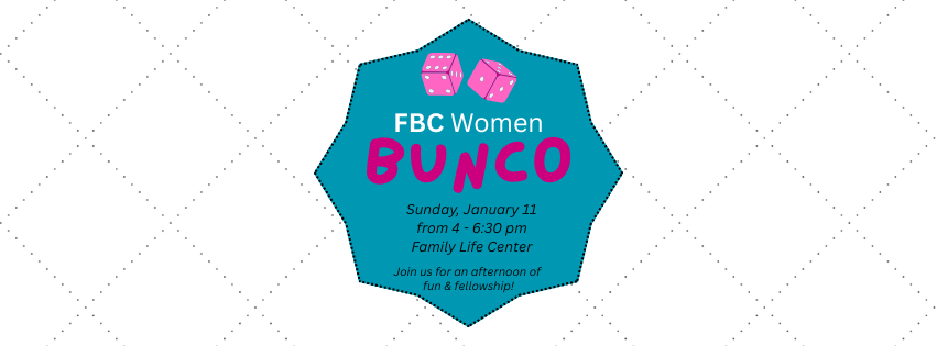 Ladies, join us for an afternoon of fellowship as we play a fun game of Bunco in the Family Life Center. Bring your favorite snack to share. Never played Bunco? No problem! We'll teach you how to play; it's quite easy!